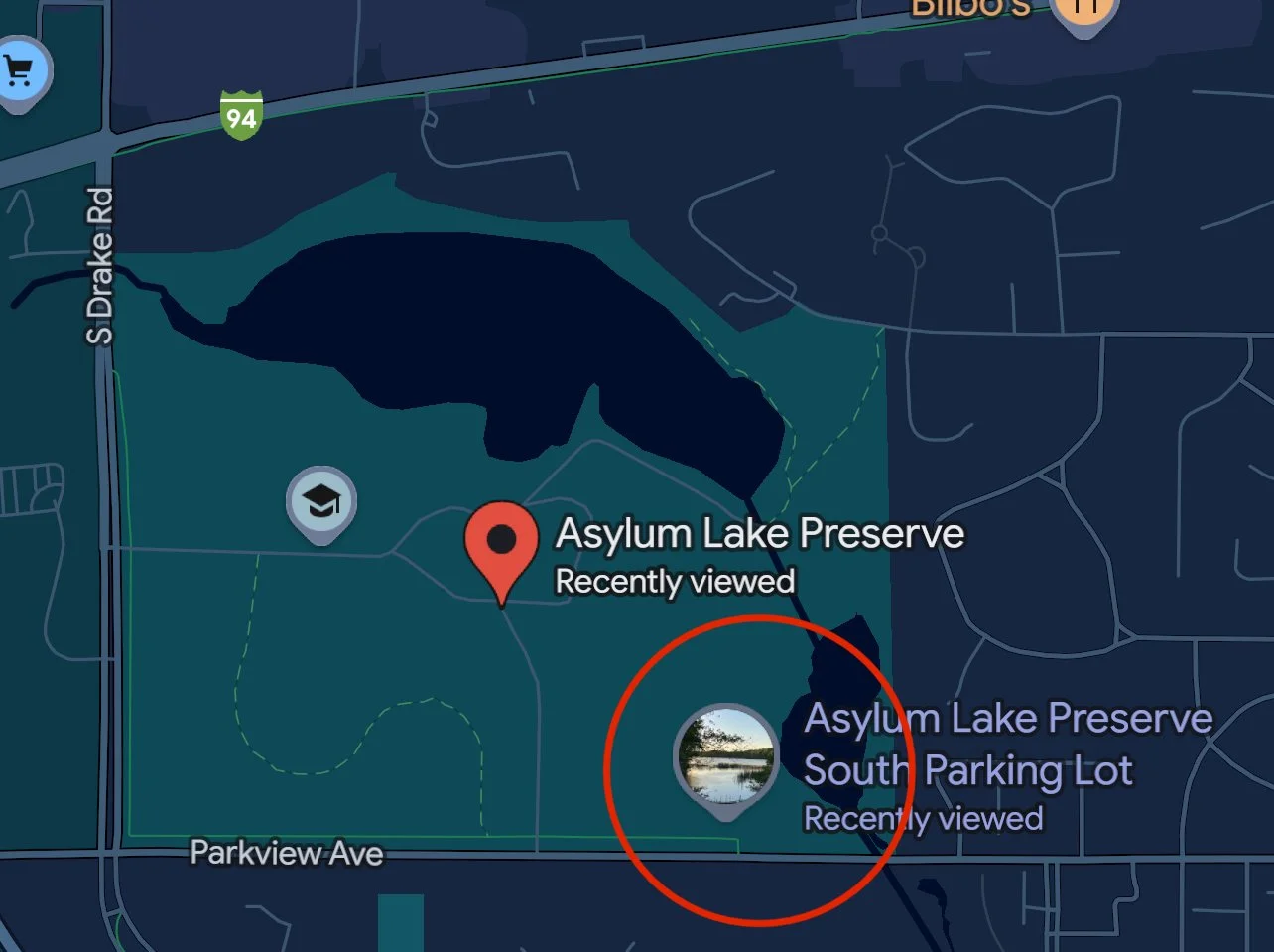 (Typing “Asylum Lake Preserve Parkview” into maps will bring you right to it!)